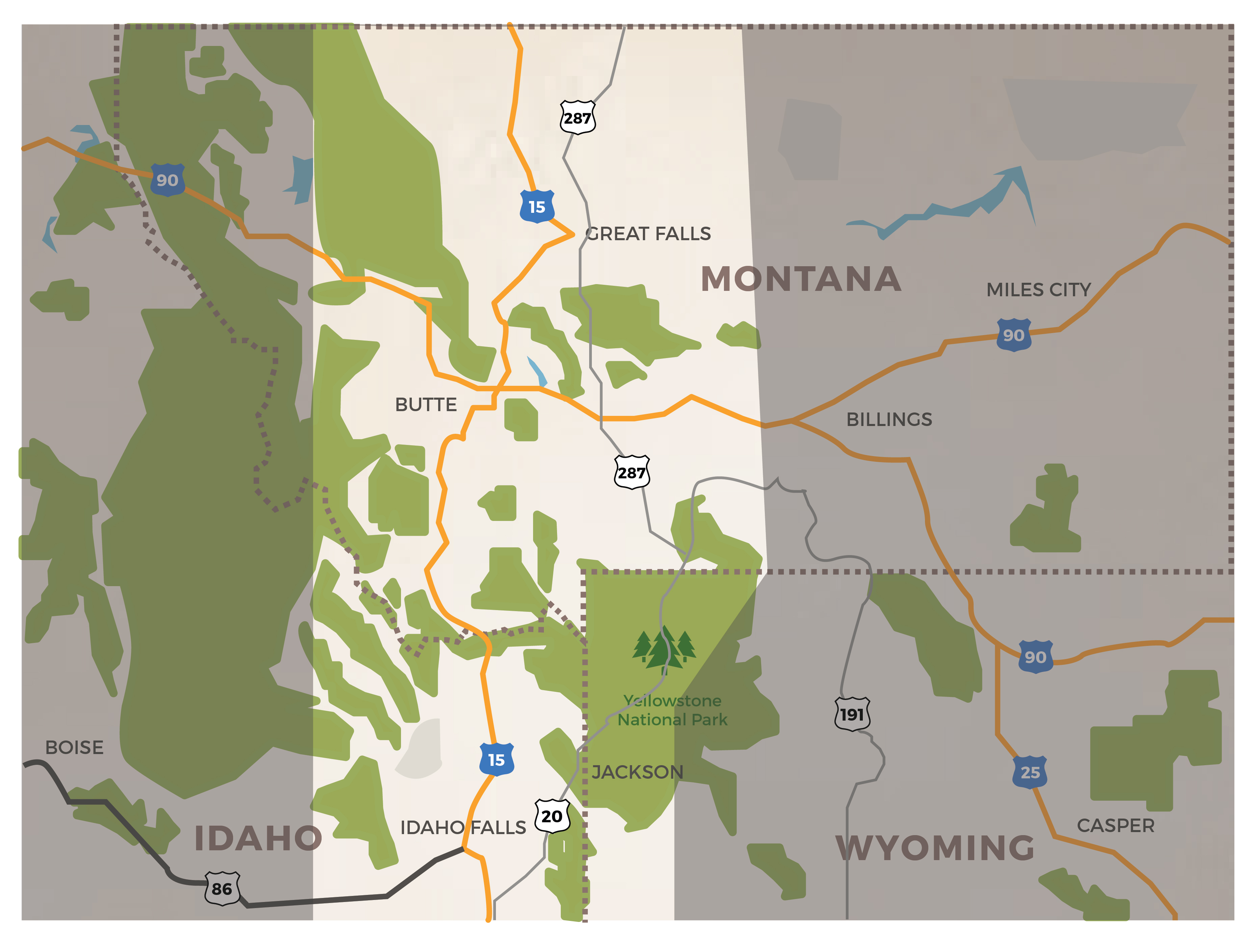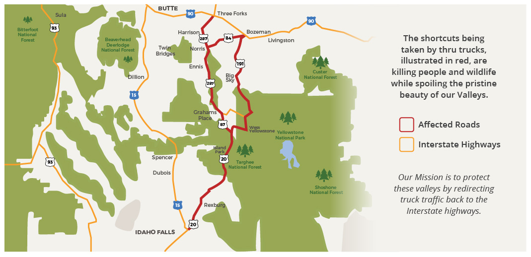 The effort to limit the impact of increasing tractor trailer traffic in the Madison and Gallatin Valleys continues, spearheaded by the Citizens Road Alliance (formerly Preserve Our Valleys). The Corporation is a public benefit, charitable corporation to slow, restrict, monitor and/or eliminate trucking over and along roads through the Yellowstone Ecosystem, specifically U.S. Highway 287, MT Highway 87, MT Highway 84, Idaho 87, U.S. Hwy. 20, U.S. Hwy. 191, and other local roadways in Madison County, Montana, and any other related activities. The map below highlights the state highways and borders of the affected areas.